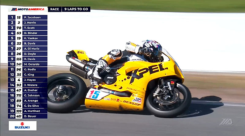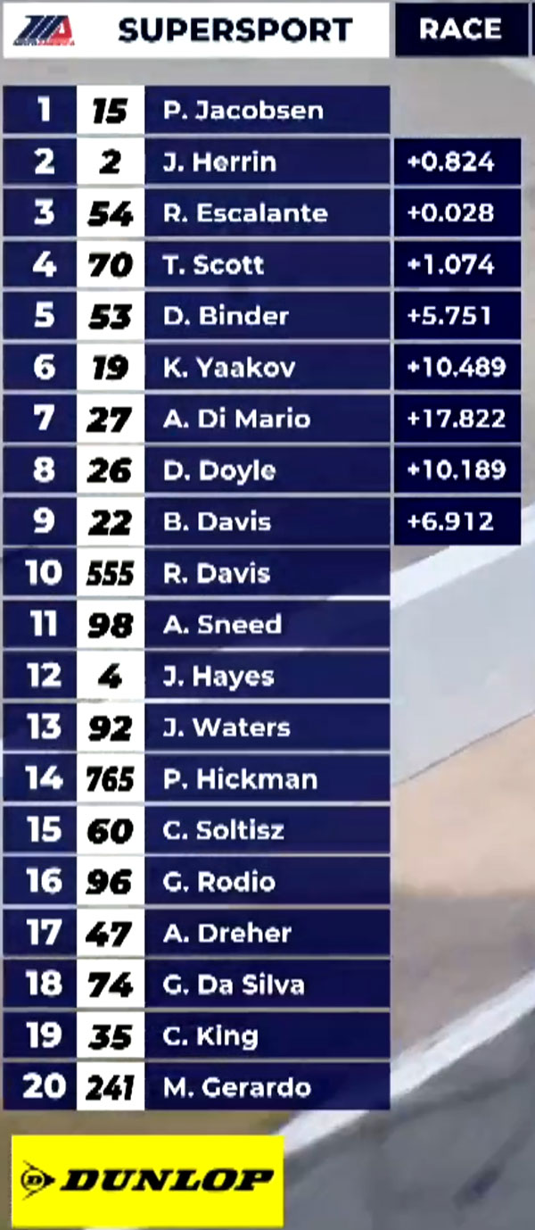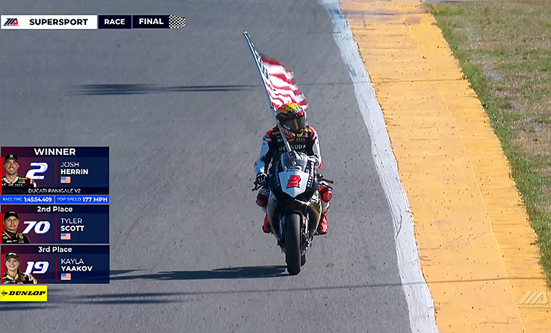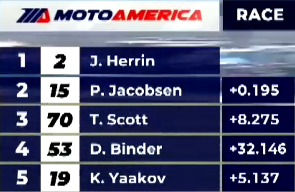 A la reprise, le classement présente Josh Herrin avec PJ Jacobsen dans sa roue, puis Richie Escalante à 4 secondes, mais à 25 tours de l’arrivée celui-ci perd le contrôle de sa Suzuki dans l’infied : course terminée !