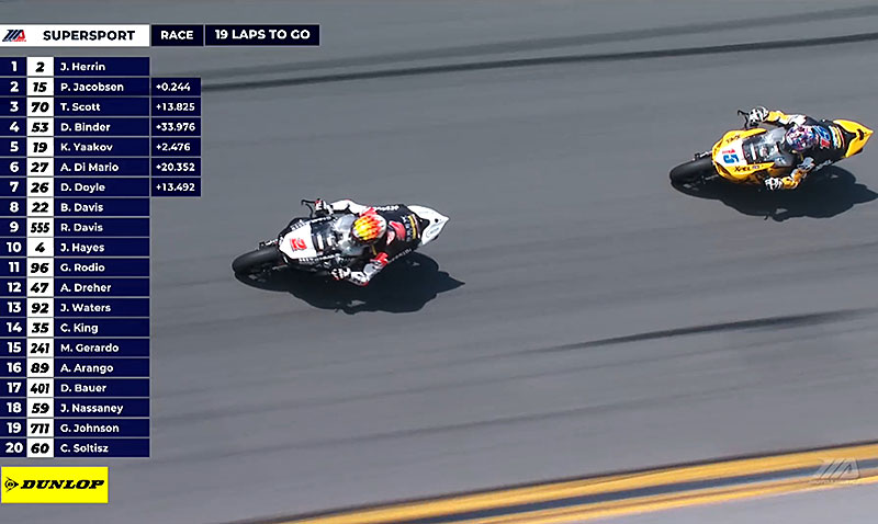 Josh Herrin et PJ Jacobsen s’arrêtent à 28 tours du drapeau à damiers. Sans surprise, les Suzuki de Richie Escalante et Tyler Scott continuent.