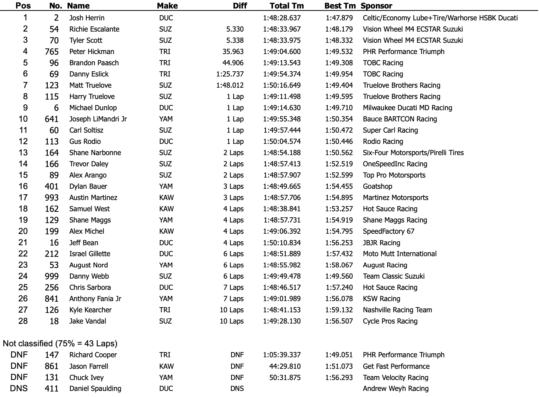 Peter Hickman, sur sa PHR Performance Triumph, a terminé quatrième, tandis que Brandon Paasch, double vainqueur du Daytona 200, a pris la cinquième place sur sa TOBC Racing Triumph. Les frères Truelove, Matt et Harry, ont respectivement terminé septième et huitième, Matt étant le dernier pilote sur le même tour que les leaders.