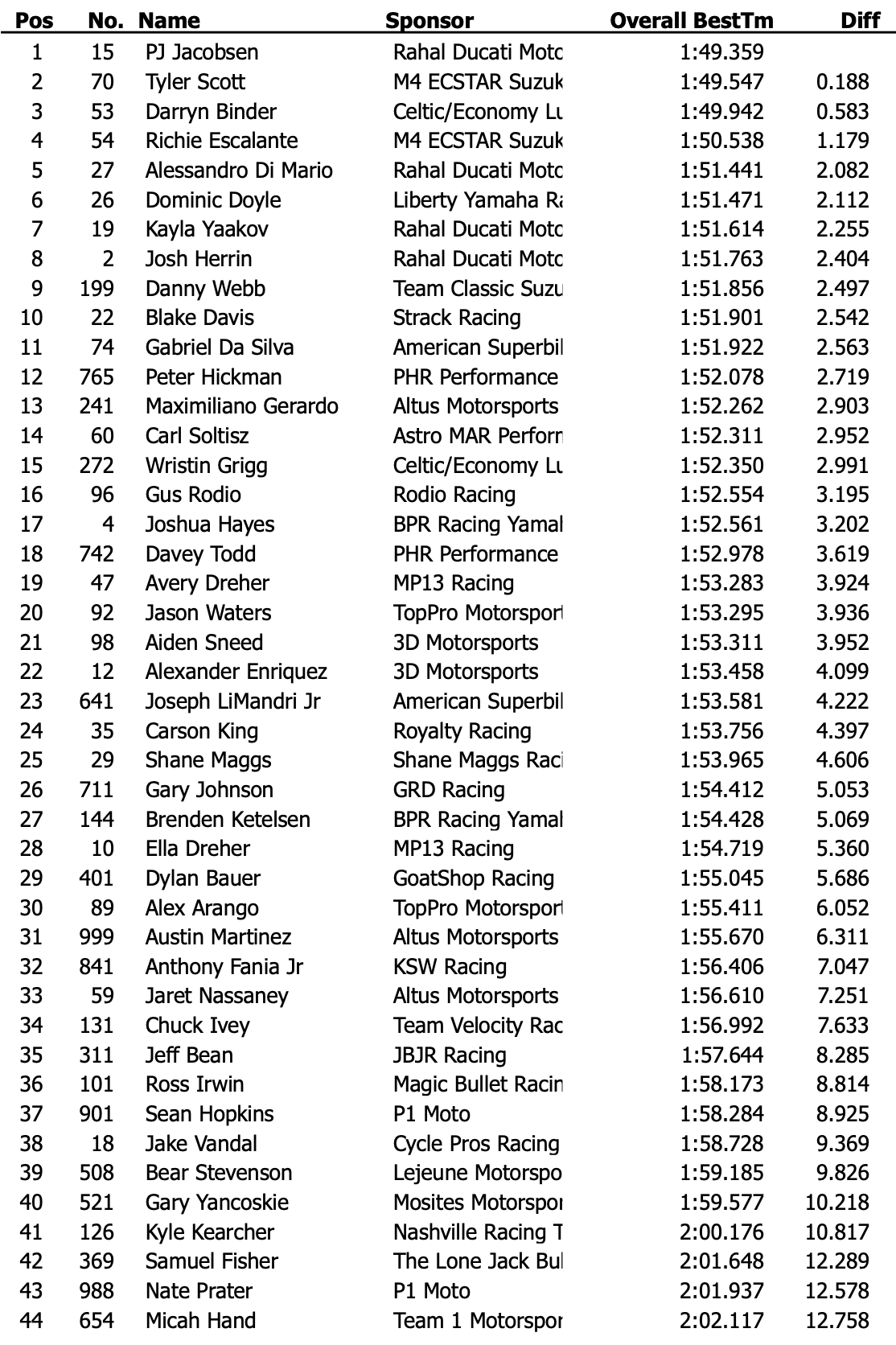 Derrière ce trio, Richie Escalante (M4 ECSTAR Suzuki) se classe quatrième avec un temps de 1:50.538, tandis que le jeune Alessandro Di Mario – seulement 17 ans et rookie du Daytona 200 – impressionne en cinquième position au guidon de la Ducati Rahal Moto with Roller Die + Forming.