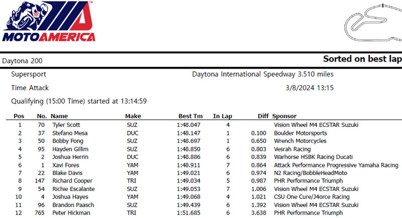 La 82e édition du Daytona 200, qui se déroule en Floride dans le cadre du championnat MotoAmerica, avait vu le record du Daytona International Speedway tomber jeudi dans l’escarcelle du pilote mexicain Richie Escalante (Vision Wheel M4 ECSTAR Suzuki), en 1’47.833, grâce à une double aspiration sur l’anneau au guidon de sa Suzuki GSX-R 750cc. Ce vendredi, c’est son coéquipier Tyler Scott qui s’accapare la pole position, après avoir connu quelques rebondissements…