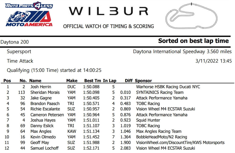 Les pilotes du groupe B étant globalement plus lents, le classement combiné de la veille restait valide jusqu’à la « Daytona Supersport Time Attack » de 15 minutes pour les 12 plus rapides.