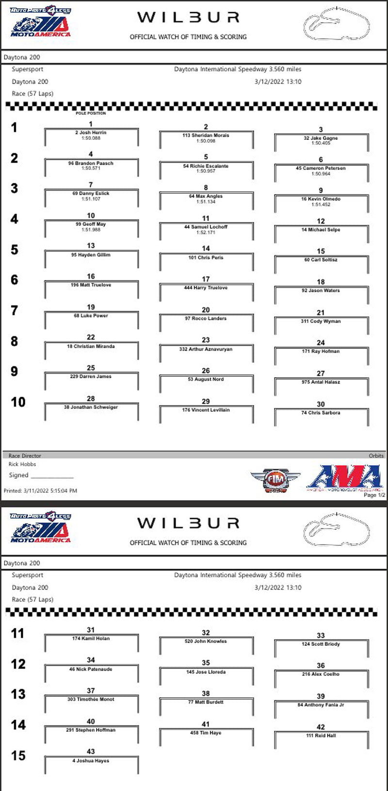 Au terme d’une séance d’essais libres non chronométrée et d’une première séance de qualification, c’est le nouveau venu Cameron Petersen qui s’avérait le plus rapide, en 1’50.544, au guidon de sa Yamaha du team Attack Performance Yamaha. Sheridan Morais (Syntainics Racing Team ) et Joshua Hayes (Squid Hunter) complétaient la domination d’Iwata devant la première Ducati, celle de Josh Herrin pour le team Warhorse HSBK Racing Ducati dans lequel courrait Loris Baz l’an dernier.