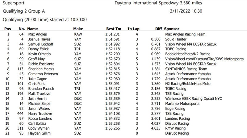La deuxième qualification du groupe A, qui contient les pilotes les plus rapides, n’a pas permis d’améliorer les chronos du jeudi, Max Angles tournant en 1’51.231 sur sa Kawasaki du team Max Angles Racing. Le première « non 600cc » est la Triumph du multiple vainqueur Danny Eslick, en 4e position  pour le team TOBC Racing.