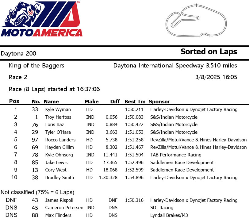 Celui-ci ne changera d’ailleurs pas la situation en tête, et Kyle Wyman résiste à l’assault final de Troy Herfoss, offrant à Harley Davidson sa troisième victoire du week-end.
