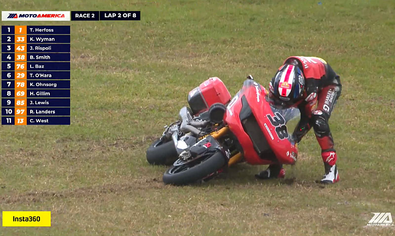A l’extinction des feux rouges, Loris Baz (S&S/Indian Motorcycle), blessé au genou, perd une place dans le premier virage mais peut cette fois continuer. Dans la deuxième courbe, le leader Kyle Wyman est lent et se fait passer par le champion en titre Troy Herfoss (S&S/Indian Motorcycle). S’agit-il déjà d’une action volontaire ?