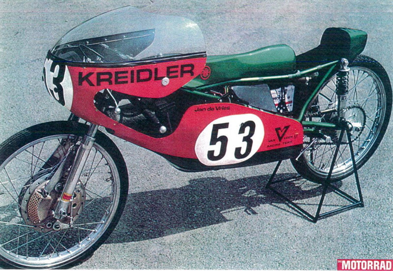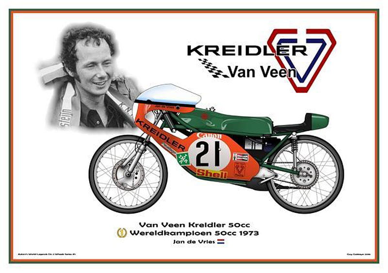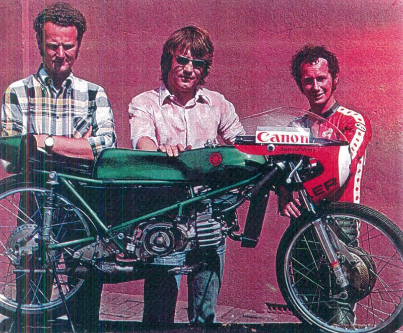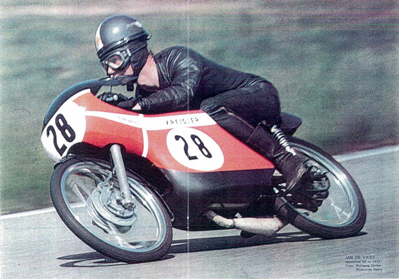 Après ses 14 victoires, ses deux titres mondiaux et son titre de vice-champion du monde (en 1972 avec le même nombre de points et de victoires qu’Angel Nieto) obtenus sur les célèbres Van Veen – Kreidler verts et orange de l’importateur néerlandais, Jan de Vries a continué à travailler pour ce dernier en tant que préparateur des 50cc de course.