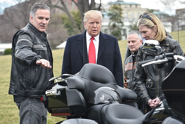 US President Donald Trump speaks with Harley Davidson CEO Matthew Levatich (L) as he greets Harley Davidson executives and union representatives on the South Lawn of the White House in Washington, DC, on February 2, 2017 prior to a luncheon with them. / AFP / NICHOLAS KAMM (Photo credit should read NICHOLAS KAMM/AFP/Getty Images)