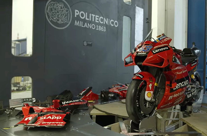 Du moins jusqu’au troisième volet, où la firme de Borgo Panigale a dévoilé quelques images d’un de ses passages à la soufflerie du Politecnico de Milan. On y voit une installation digne d’un film de science-fiction apporter une GP 21 dans la veine : très impressionnant !