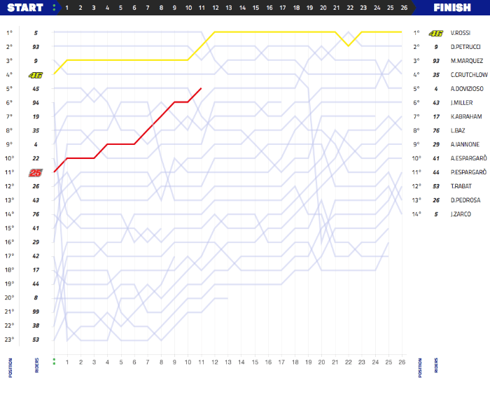 Maverick Viñales : « Je ne peux pas expliquer ce qui est arrivé, parce que je ne sais même pas pourquoi j’ai chuté. Je suis passé là 2000 fois, mais aujourd’hui, c’était le jour. J’étais en train d’attaquer à la limite, essayant de placer la Yamaha au sommet, et je pense que si je ne n’étais pas tombé, j’aurais pu revenir sur les pilotes de tête, parce que notre rythme était très rapide. Nous devons apprendre que le minimum à atteindre en qualification est sixième ou cinquième, donc je sais que l’erreur a été commise hier, et pas aujourd’hui. je me sentais très bien sur la moto aujourd’hui. J’essayais de conserver les pneus à un bon niveau et je préparais une attaque sur les dix derniers tours. Je pilotais d’une bonne manière et vraiment de façon fluide sur toute la piste, et je me sentais beaucoup plus fort que les autres pilotes, je donnais le meilleur de moi-même. Cette chute est quelque chose que nous ne pouvons pas expliquer, nous pouvons seulement en retirer des enseignements, en particulier concernant la qualification. Ce matin, je savais que cela allait être délicat et j’ai fait de mon mieux : c’était tout ou rien, et finalement cela a été rien. Nous devrons rattraper cela lors des prochaines courses et nous nous attendons à quelque chose de différent. »