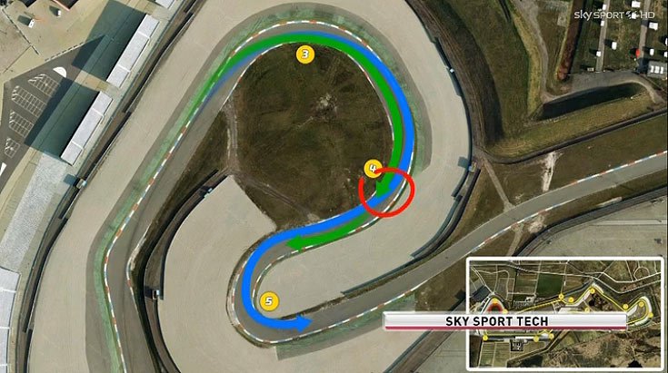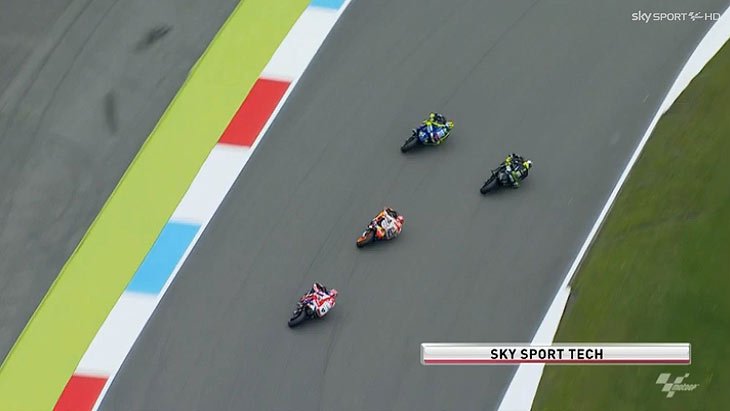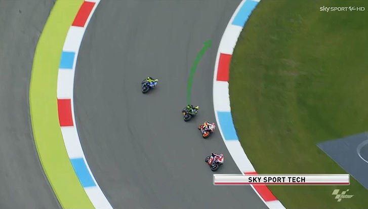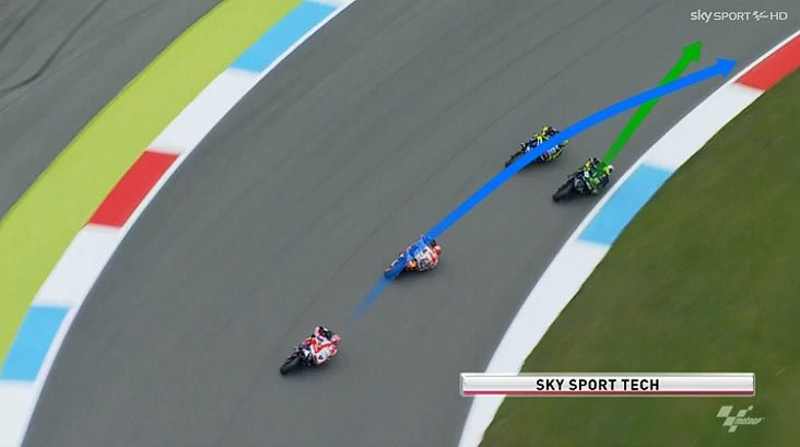 Au 11e tour de la course, Valentino Rossi double Johann Zarco au freinage en bout de ligne droite. Après la cassure du #2, il arrive dans l’interminable courbe constituée des virages à droite #3 et #4, et utilise alors une trajectoire qui consiste à élargir en sortie du #3 pour pouvoir plonger dans le #4 et en ressortir sans s’écarter, afin d’aborder le #5 dans de bonnes conditions. Marc Márquez et Andrea Dovizioso utilisent une trajectoire intermédiaire, plus resserrée dans le #3.
