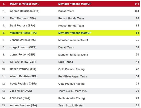 Après deux superbes victoires lors des Grands Prix inauguraux au Qatar et en Argentine, Vinales a connu des week-ends pénibles à Jerez (sixième) et à Barcelone (dixième). Mais une nouvelle victoire en France et une deuxième place en Italie lui permettent de toujours figurer en tête du Championnat du Monde, mais avec seulement sept points d’avance sur Andrea Dovizioso.