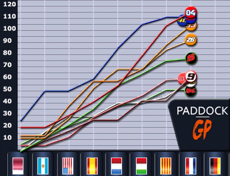 La mi-saison arrive et nous voilà avec quatre pilotes réunis en seulement onze points. Le plus inédit est que ce soit une Ducati qui mène la danse, celle d’un Dovizioso irréprochable qui score 115 points. Un capital supérieur de quatre unités à celui de Viñales à la récolte batave vierge, si bien que l’officiel Yamaha voit revenir sur lui son équipier Rossi à trois longueurs.