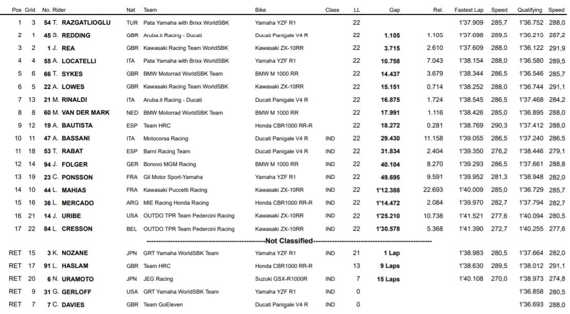 A l’arrivée, le Nord-Irlandais se voulait beau joueur face aux deux pilotes qui l’ont précédé sous le drapeau à damier. « Ce fut une course solide, mais au début je n’avais pas le rythme pour suivre Toprak [Razgatlioglu] », a-t-il ainsi concédé au micro du site officiel du Superbike. « J’ai essayé de les suivre pendant à peu près une dizaine de tours. J’étais dans le coup, en particulier dans l’enchaînement des virages 3 à 6, qui est un secteur assez bosselé, mais à cause de mon pneu j’ai aussi commencé à perdre du terrain dans les portions où eux étaient rapides. »
