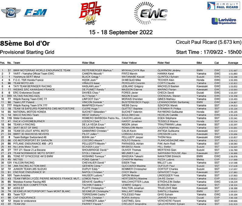 Illya Mykhalchyk a terminé en tête du classement des pilotes Jaunes, toujours pour le BMW Motorrad World Endurance Team, son impressionnant 1’51”641 étant de 0”183 plus rapide que le meilleur temps de Marvin Fritz pour le YART – Yamaha Official Team EWC. Kazuki Watanabe (Yoshimura SERT Motul) s’est classé troisième en 1’52”508, suivi du jeune pilote français Corentin Perolari du Team Moto Ain avec un 1’52”898. Mike Di Meglio (1’52”953) a pris la cinquième place pour F.C.C. TSR Honda France devant Xavi Forés d’ERC-Endurance Ducati (1’53”189). Sheridan Marais venait ensuite pour le Wójcik Racing Team en 1’53”461 devant un quadruple vainqueur du Bol d’Or, Grégory Leblanc (1’53”684), huitième avec le TATI Team Beringer Racing. Erwan Nigon (1’53”917) et Étienne Masson (1’54”043) ont complété le top 10 pour Viltaïs Racing Igol et Webike SRC Kawasaki France respectivement.
