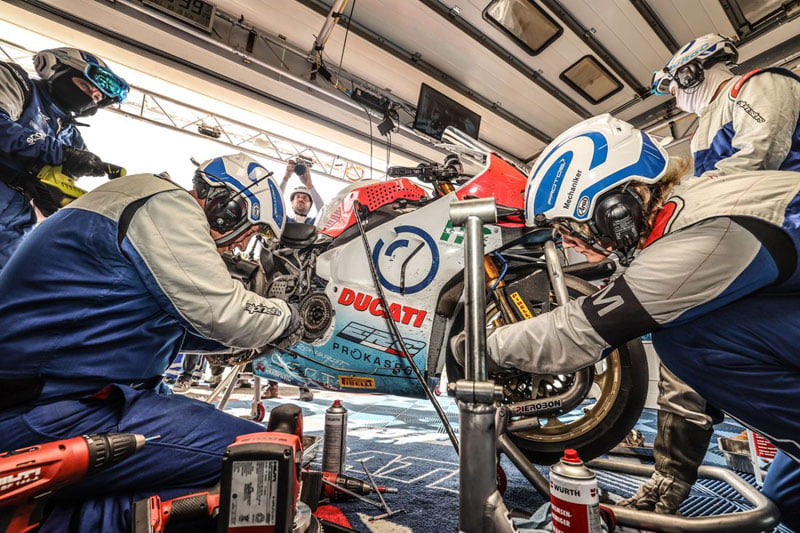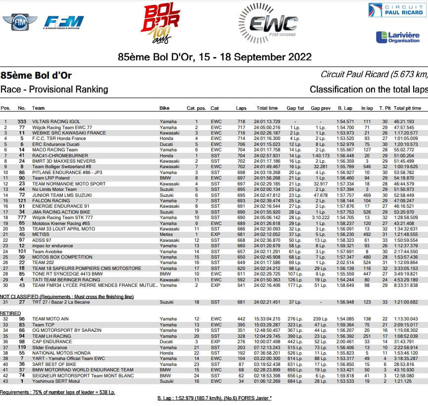 Pour les pilotes ERC David Checa et Xavi Forés, ce déchirement tardif a été extrêmement difficile à vivre alors qu’ils s’étaient partagé les relais durant une bonne partie de la course en raison d’une blessure au dos de Chaz Davies qui n’avait pu poursuivre la course. Malgré une grande émotion dans le garage, Checa a trouvé le courage de repartir pour la dernière heure après les réparations effectuées par l’équipe allemande. Il a pris la cinquième place derrière F.C.C. TSR Honda France, qui remporte le Championnat du monde d’Endurance de la FIM après avoir dû effectuer elle aussi un arrêt au stand non prévu dans les deux dernières heures. MACO Racing a pris une belle sixième place.