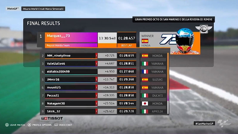 Marc Márquez, 2e : « jusqu’à présent, il s’agit de mon meilleur résultat au jeu MotoGP et je peux maintenant prendre ma retraite (rires) du jeu. Il va y avoir une grosse fête ce soir car la famille a fait premier et deuxième, et c’est super, même pour l’équipe ! Cela a été très bonne journée et, oui, j’ai utilisé ma tactique qui consiste à rester sur la moto, ce qui est le plus important. Je suis resté sur la moto et c’est dommage que mon frère m’ait battu dans le dernier virage, mais nous allons avoir une discussion car… hum… je n’aime pas perdre une course dans le dernier virage (rires). Mais quoi qu’il en soit, si je dois perdre contre quelqu’un, je préfère que ce soit contre mon frère. Le problème, c’est que quand j’ai vu que Quartararo chutait, je me suis détendu car je savais que le podium était là, et si je chutais dans le dernier virage, le podium s’envolait. Mais dans le dernier virage, c’était peut-être de ma faute car j’étais peut-être trop nerveux, mais j’ai appuyé trop longtemps sur le bouton du frein arrière, donc j’ai glissé, comme dans la réalité : j’ai élargi ! Mais quoi qu’il en soit, c’était une belle journée pour le team Repsol Honda (rires). »