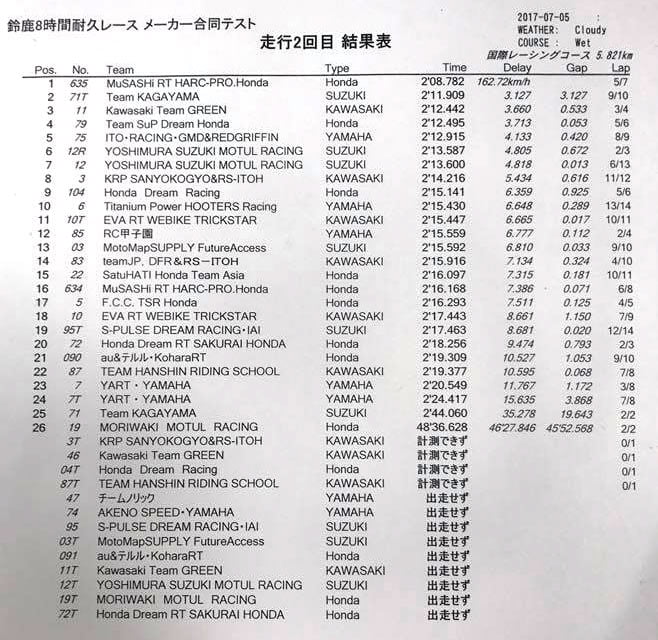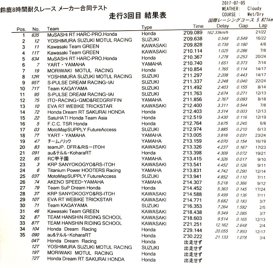 La Suzuki Yoshimura officielle de Takuya Tsuda et Sylvain Guintoli (Josh Brookes absent) s’emparait de la deuxième place alors que les deux Kawasaki officielles du team Green complétaient ce top 5 en ayant effectué que huit tours.