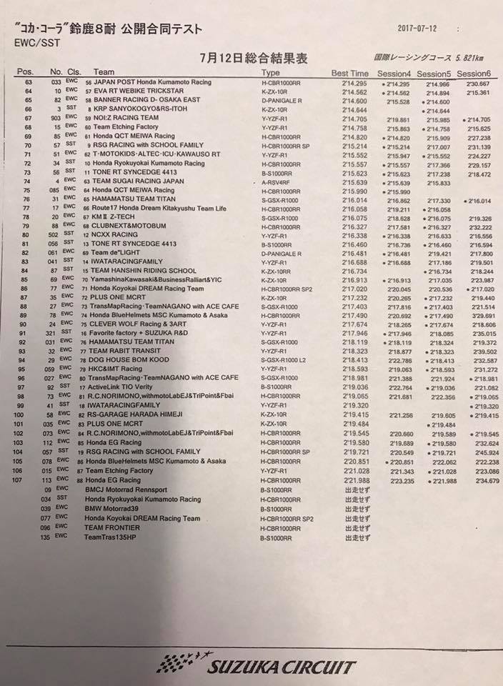 Dans le groupe B, sans grande surprise, c’est la Suzuki Yoshimura officielle (Motul Racing Suzuki GSX-R 1000 2017 #12, Takuya Tsuda, Sylvain Guintoli, Josh Brookes) qui menait les débat en 2’07.954 devant le YART (Yamaha YZF R1 #7, Broc Parkes, Marvin Fritz, Kohta Nozane) et le F.C.C. TSR Honda (Honda CBR 1000RR SP2 #5, Stefan Bradl, Dominique Aegerter, Randy de Puniet).