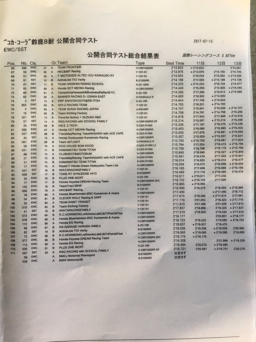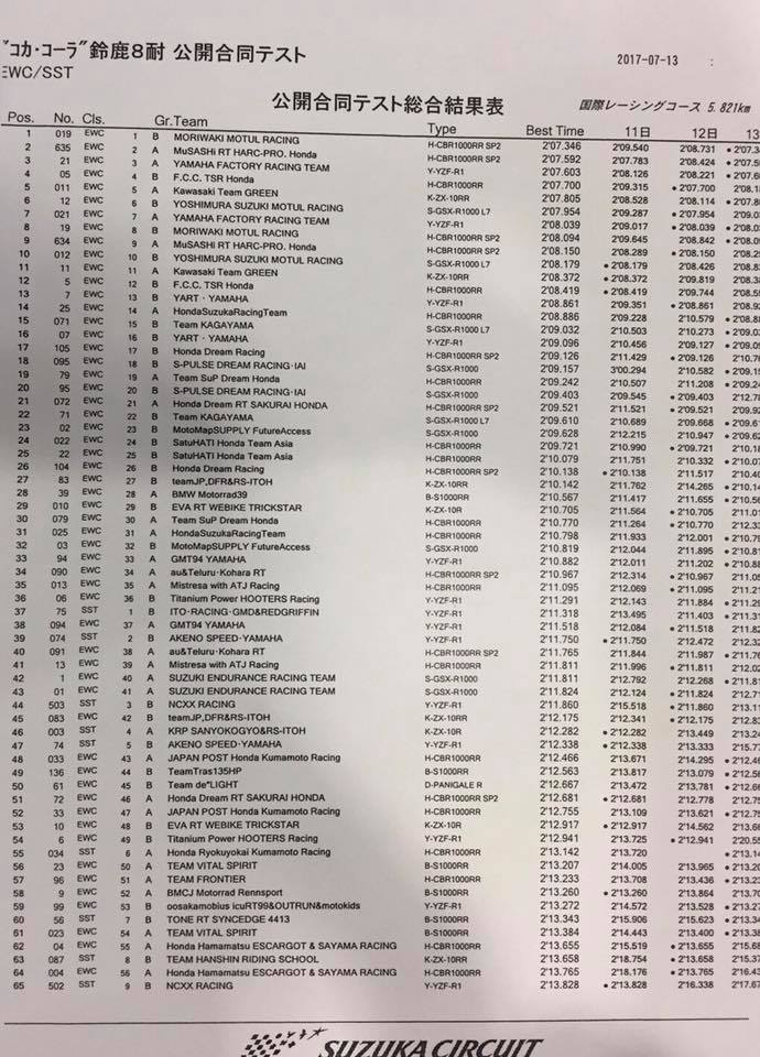 Honda s’est donc révélé le plus rapide durant chacune de ces trois journées d’essais, tout d’abord avec la MuSASHi RT HARC-PRO Honda (Honda CBR 1000RR SP2 #634, Takumi Takahashi, Takaaki Nakagami, Jack Miller), puis la F.C.C. TSR Honda (Honda CBR 1000RR SP2 #5, Stefan Bradl, Dominique Aegerter, Randy de Puniet) et enfin la Moriwaki Motul Racing (Honda CBR 1000RR SP2 #19, Yuki Takahashi, Ryuichi Kiyonari, Dan Linfoot).