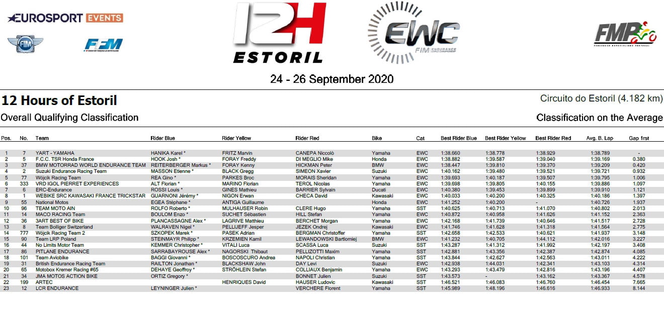 A la moyenne des chronos des trois pilotes, c’est toutefois le YART-Yamaha qui arrache la pole position devant la F.C.C. TSR Honda France, la BMW Motorrad, le SERT et le F.C.C. TSR Honda France.