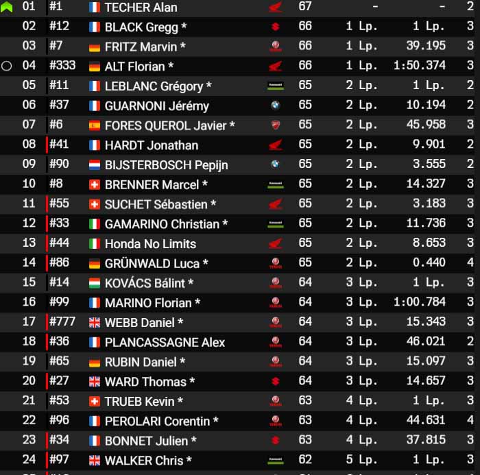 À vrai dire, depuis l’extinction des feux, la Yamaha YZF-R1 de la structure autrichienne est significativement plus rapide. Gregg Black puis Sylvain Guintoli ont dû cravacher pour maintenir la Suzuki GSX-R 1000, et Étienne Masson voit désormais revenir la Honda #1 F.C.C TSR Honda France. Leur deuxième place est plus menacée que jamais. En plus, la Suzuki #1 a subi une panne d’essence mais heureusement, elle a pu rejoindre son stand.