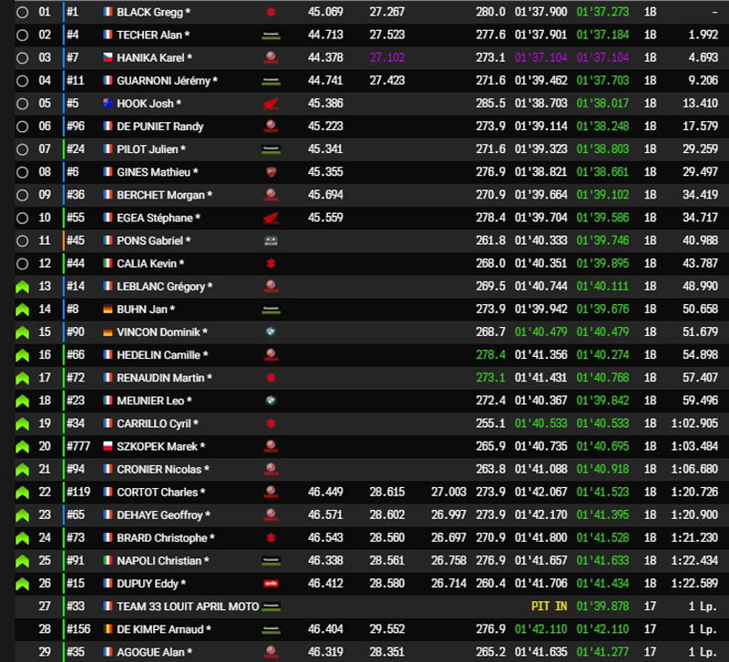 En tête, la Suzuki #1 pilotée par Gregg Black se voit quasiment rejointe par la Kawasaki #4 d’Alan Techer mais conserve néanmoins deux secondes d’avance.