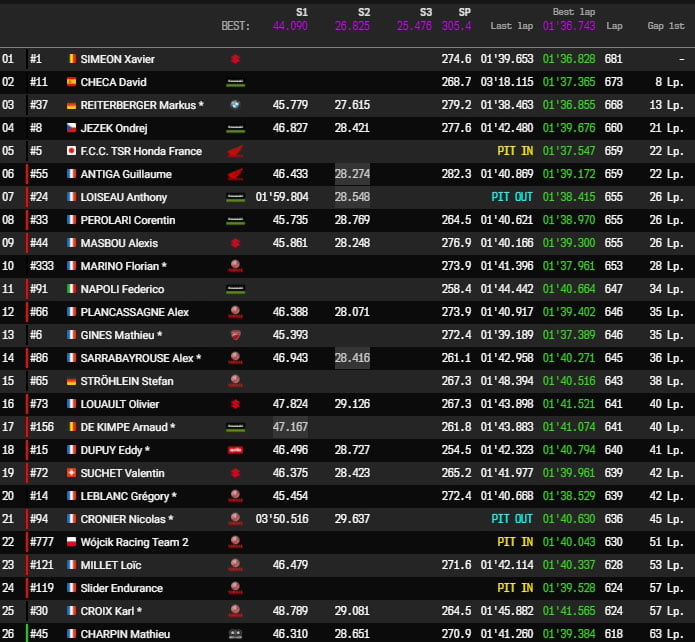 Du coup, la F.C.C. TSR Honda France #5, plutôt discrète en début de course, héritait de la deuxième position, trois tours derrière un leader imperturbable et autant devant la Webike SRC Kawasaki France Trickstar #11 qui avaient connu des problèmes de frein.