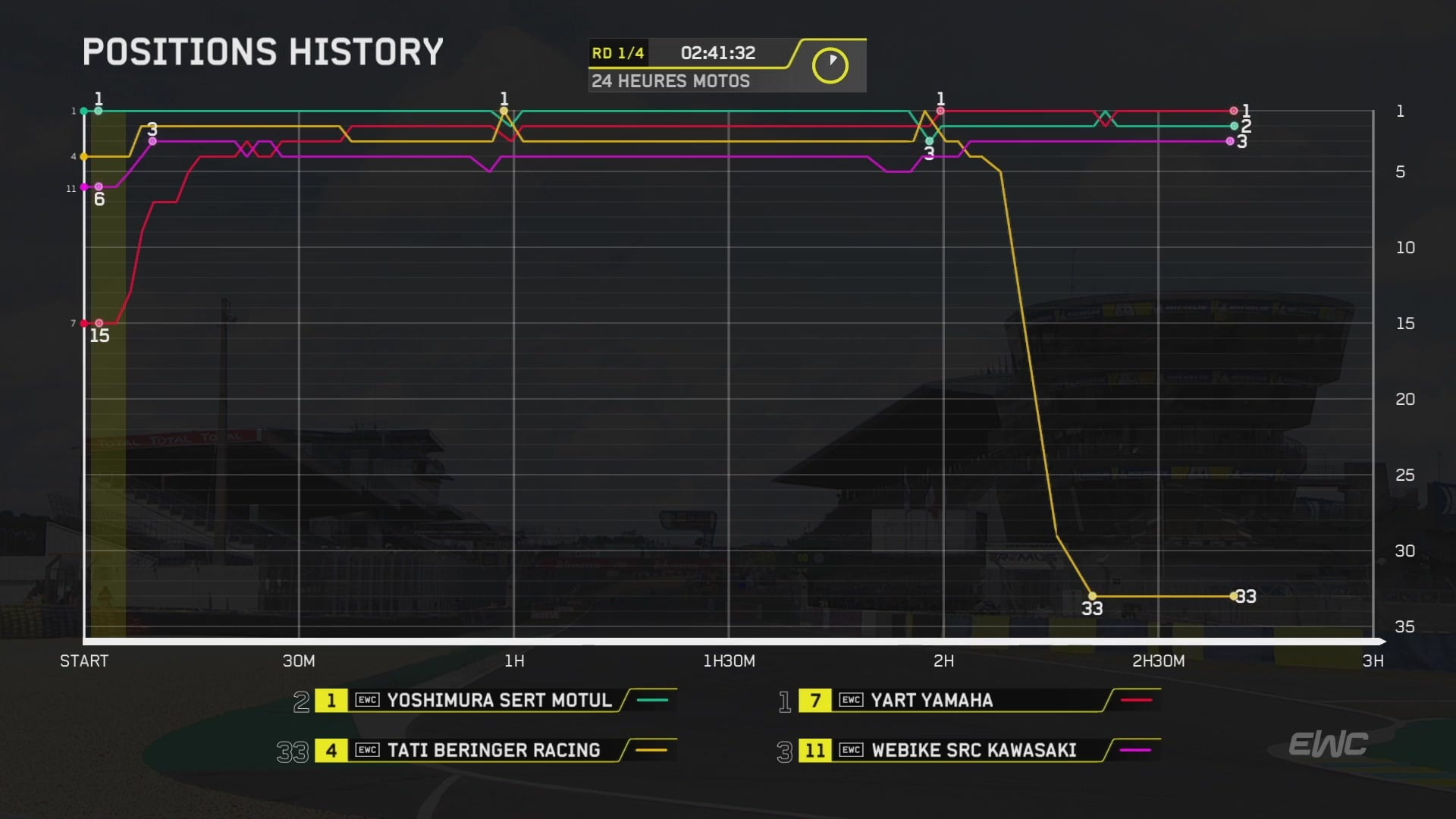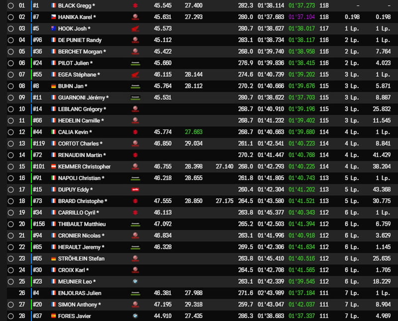 A ce petit jeu, c’est toutefois la Kawasaki #4 du Tati Team Beringer Racing, auteur d’un très beau début de course avec Alan Techer, qui tirait son épingle des arrêts au stand en s’emparant très provisoirement du commandement avec un avantage de 4 secondes en bénéficiant d’un ravitaillement anticipé d’un tour.