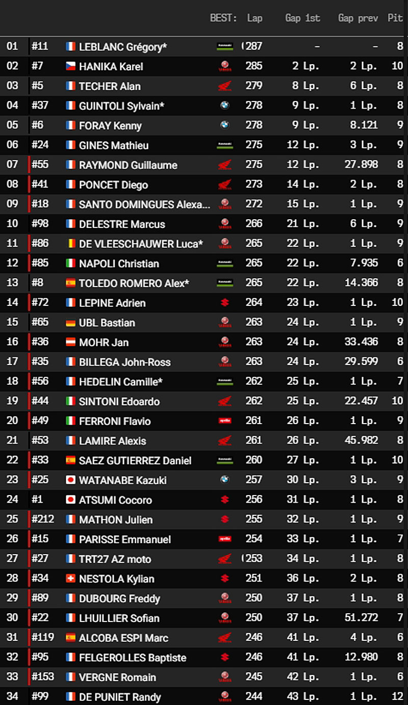 Quoi qu’il en soit, depuis notre dernier point de situation, la Kawasaki Webike Trickstar #11 pilotée par Román Ramos a pris le lead une heure et quart avant le cap du changement de journée, reléguant la Yamalube YART Yamaha EWC Official Team #7 menée par Jason O’Halloran au second rang. Dans la foulée, la R1 a connu une perte de contrôle, occasionnant un rapide passage au box, le tout lui faisant perdre deux tours.