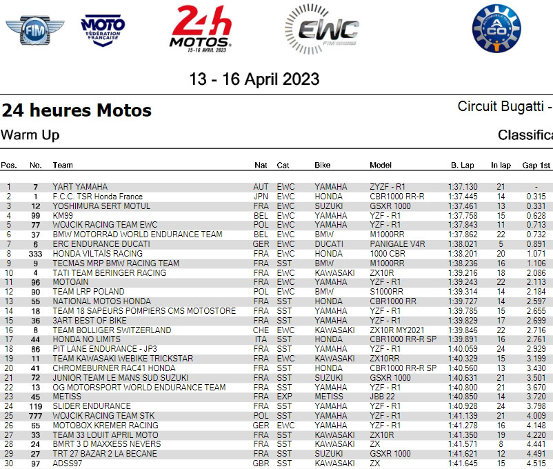 EWC 24 Heures Motos Le Mans : YART – Yamaha domine le warmup