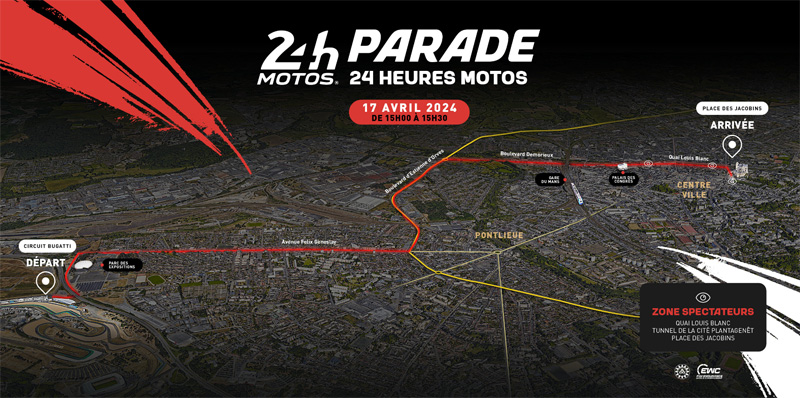 Cette parade, qui permettra à tous les manceaux de découvrir les concurrents de cette course légendaire, traversera plusieurs points clés de la ville. A la sortie du circuit, les pilotes emprunteront l’Avenue Felix Geneslay, puis le boulevard d’Estienne d’Orves, avant de se rendre sur le boulevard Demorieux. A l’approche de la Place des Jacobins, les 48 motos défileront sur le quai Louis Blanc, et emprunteront la rue Wilbur Wright, sous le tunnel de la Cité Plantagenet. L’ensemble de ces points sera accessible au grand public, qui pourra admirer les machines dans un cadre inédit.
