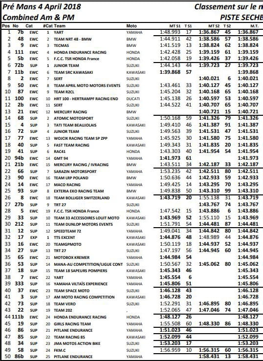 Le Yart-Yamaha a profité d’une piste sèche mercredi pour affirmer ses ambitions de victoire en fixant la référence chronométrique à 1’36 »867. La BMW n°48 de l’équipe NRT48-BMW Motorrad est relayée à 1,7 secondes. La BMW n°9 du Tecmas BMW complète le top trois du classement général. La Yamaha n°94 du GMT94-Yamaha, vainqueur de la précédente édition des 24 Heures Motos se réjouit de la performance et de la polyvalence de ses pneumatiques Dunlop.