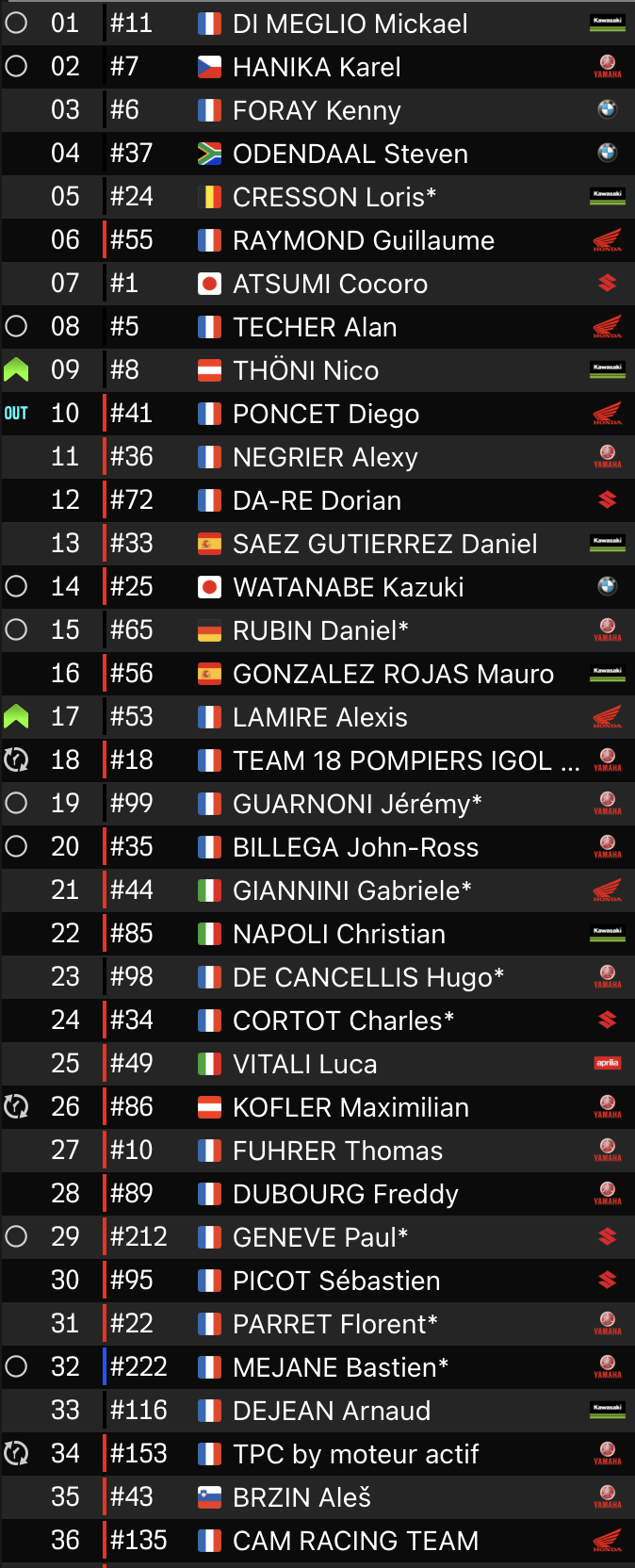 Ce matin, elle compte quatre tours d’avance sur la Yamaha n°7 du YART, tandis que la BMW n°6 de l’équipage de Kenny Foray complète désormais le podium provisoire, à treize tours.