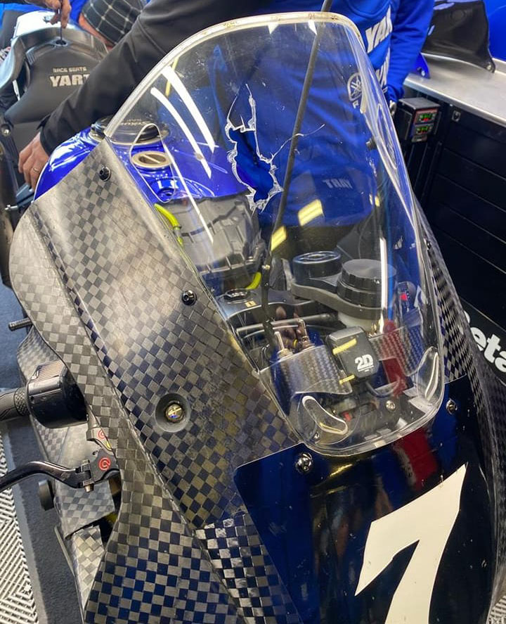 Petite séquence émotion filmée par la Yamaha #777 du Wojcik Racing Team EWC pilotée par Kevin Manfredi, mais plus de peur que de mal pour les pilotes… tout comme pour la bulle de la YART – Yamaha, victime d’une pierre errante.