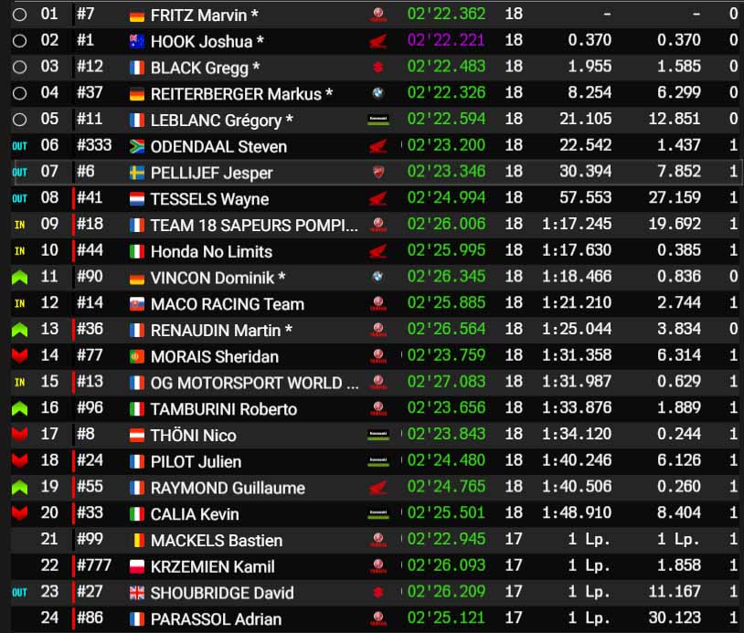 Grosse bataille entre Josh Hook et Marvin Fritz, alors que petit à petit, Gregg Black s’affirme en tête sans pour autant s’échapper. D’ailleurs, la Yamaha #7 porte l’estocade dans le 12e tour. Le YART retrouve sa position initiale après une entame en demi-teinte, comme souvent. Black, à l’aspiration, reprend son bien en moins de temps qu’il faut pour le dire. Quelles images ! Les trois équipes en tête se passent, se repassent, et proposent un spectacle grandiose avant le bal des arrêts aux stands.