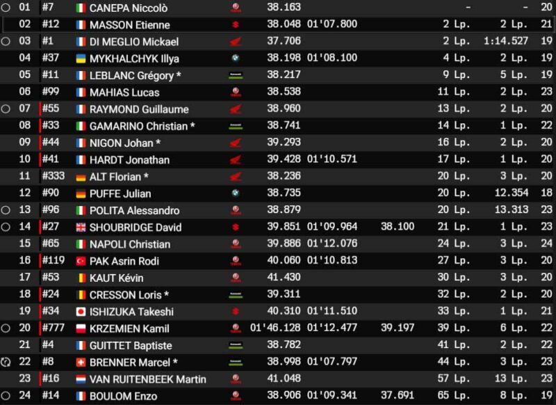 Outre la Honda #41, d’autres motos se sont fait piéger ou on connu des problèmes. C’est le cas de la Yamaha #777 Wójcik Racing Team STK, par terre, mais aussi de la Kawasaki #8 Team Bolliger Switzerland. Le toboggan des Ardennes est intransigeant avec quiconque désire le conquérir.