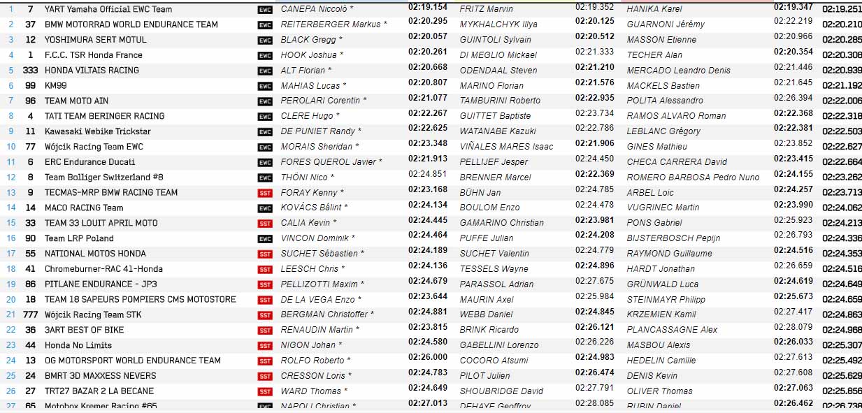 En catégorie Superstock, l’équipage de la BMW M 1000 RR #9 de Tecmas-MRP BMW Racing Team qui a pris le meilleur sur ses adversaires, ce qui confirme sa bonne forme après sa victoire en catégorie lors des 24 Heures motos. De toute évidence, l’équipage composé du Bisontin Loïc Arbel, Kenny Foray et Jan Bühn est favori à Spa-Francorchamps, mais aussi pour l’obtention du titre mondial FIM Endurance World Cup.