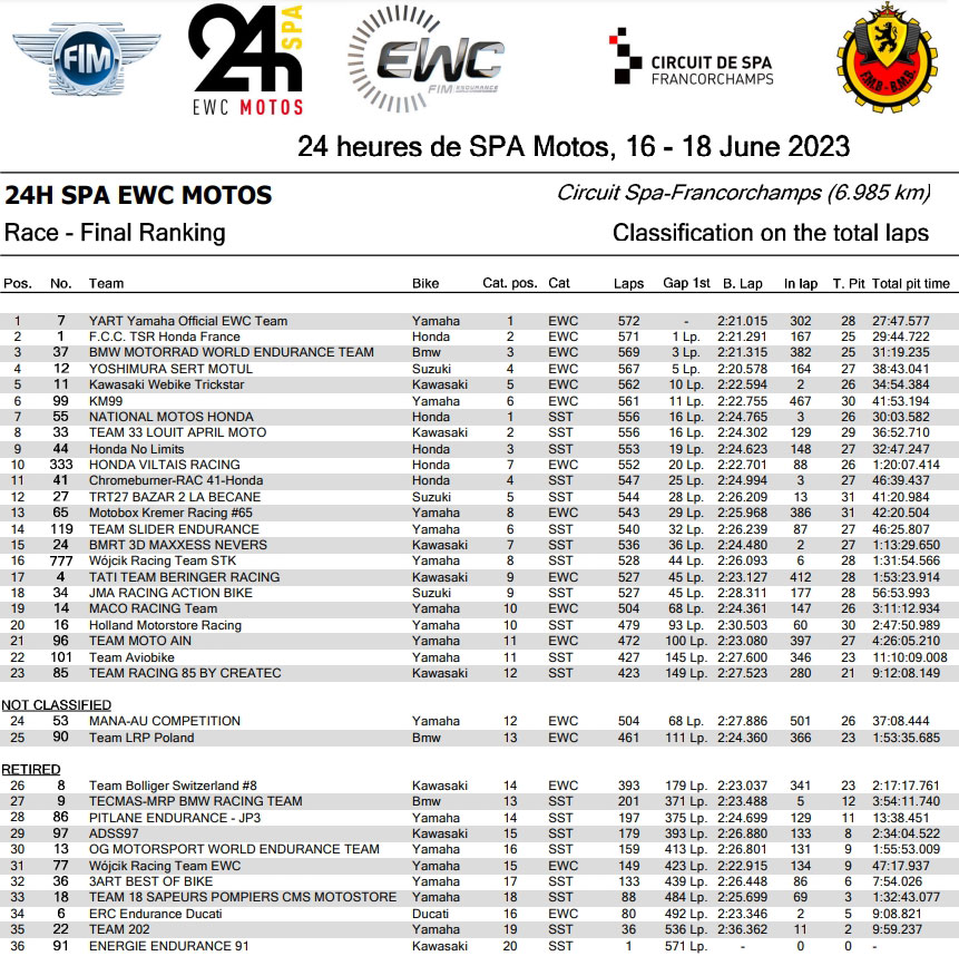 Le YART Yamaha Official EWC a pris la tête du classement provisoire du Championnat du Monde d’Endurance FIM avec sa victoire aux 24H SPA EWC Motos, aujourd’hui (dimanche), un résultat qui met fin à une attente de 14 ans pour l’équipe autrichienne sur un double tour d’horloge.