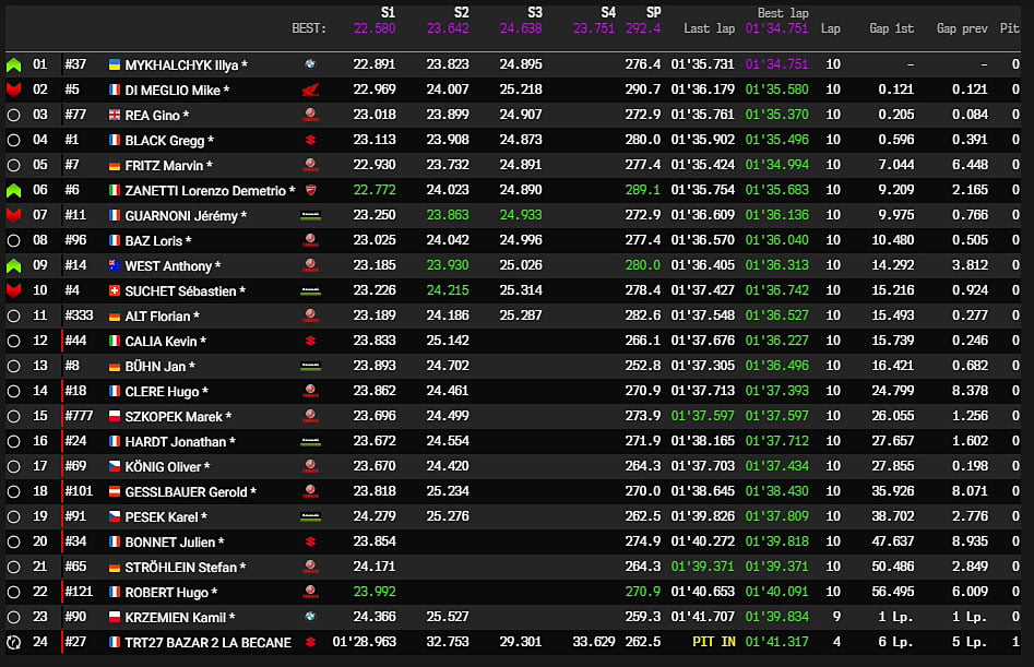 Mike Di Meglio s’empare du commandement dans la foulée pendant que Marvin Fritz entame sa remontée sur la Yamaha #7, et que Illya Mykhalchyk tente de combler l’écart avec le trio de tête sur la BMW #37. On le sait, la machine allemande est d’autant plus rapide qu’elle a fait des essais privés ici, et la jonction est faite en moins de 10 minutes.