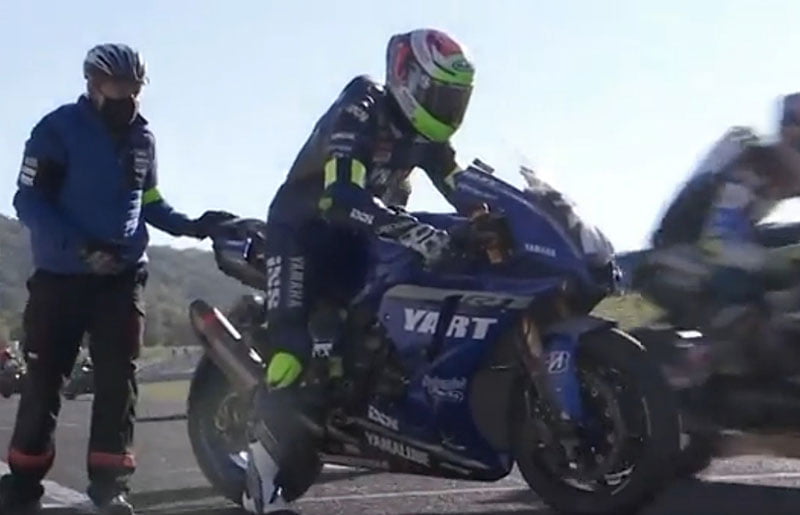 À l’extinction des feux rouges, malheureusement un peu comme d’habitude, le YART qui bénéficiait de la pole position connaît des problèmes pour démarrer, et c’est Gregg Black sur la Suzuki #1, Mike Di Meglio sur la Honda #5 et Gino Rea sur la Yamaha #77 qui dirigent la meute et créent même un écart de plus d’une seconde à la fin du premier tour alors que la Yamaha #7 apparaît seulement en 20e position.