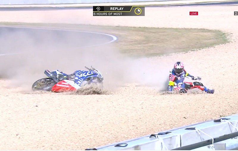 Alors qu’elle occupait la deuxième position des 6 Hours of Most avec Josh Hook, la F.C.C. TSR Honda France est partie à la faute à 12h48, juste après son deuxième ravitaillement lors duquel Yuki Takahashi avait pris le guidon.