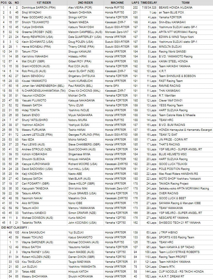 La course a été une bataille difficile, avec les équipes de premier plan qui se sont confrontées les unes après les autres à des chutes et des problèmes de moto, et les équipes d’usine de Yamaha n’ont pas fait exception. Rainey et Magee ont eu un soudain problème de moteur dans la ligne droite principale et ont été contraints de se retirer après 94 tours, et une chute a mis fin prématurément à la course de Gardner et Doohan. A ce moment, Taira et Kocinski étaient 3e avant que la chute de Doohan ne les propulse au 2e rang, et à partir de ce moment, ils se sont mis à poursuivre l’équipe d’endurance de Honda France qui occupait la tête avec Dominique Sarron et Alex Vieira. Mais alors que Kocinski était en piste, la YZF750 #21 a connu un problème technique au 163e tour qui a fait que l’équipe TECH21 n’a pas pu franchir la ligne d’arrivée. Peu de temps après, un problème mécanique est également survenu sur la YZF750 de Dawson et Machii, marquant la fin de toute chance d’obtenir un triplé à Suzuka. Sarron et Vieira ont finalement remporté la victoire, les honneurs de la meilleure Yamaha revenant à l’équipe privée de l’Australien Peter Goddard et Shingo Kato, qui a terminé à la 3e place sur le podium avec  une FZR750R.