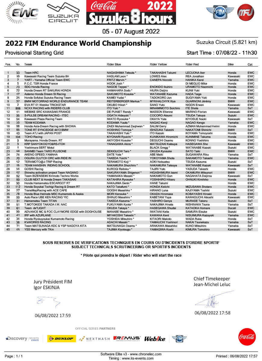Avec un nouveau record du tour, Tetsuta Nagashima emmène Honda HRC en pole position aux 8 Heures de Suzuka devant Kawasaki KRT avec Rea, troisième Niccolò Canepa avec YART-Yamaha, Gino Rea (F.C.C. TSR Honda) transporté à l’hôpital.