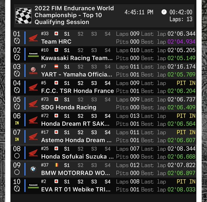 Bien qu’il s’agisse d’une séance de qualification de 40 minutes remplaçant le fameux Top 10 Trial annulé en raison de la menace de pluie, le spectacle n’a pas manqué. L’édition 2022 des 8 Heures de Suzuka verra le Team HRC s’élancer en pole position grâce à un Tetsuta Nagashima déchaîné, auteur du nouveau record du tour à Suzuka dans un week-end de course de 8 heures en 2’04″934. Le pilote d’essai officiel de Honda en MotoGP et Superbike, après un impressionnant 2’04″942 établi hier, a encore progressé, se payant le luxe de battre le sextuple champion du monde Jonathan Rea en comparaison directe.