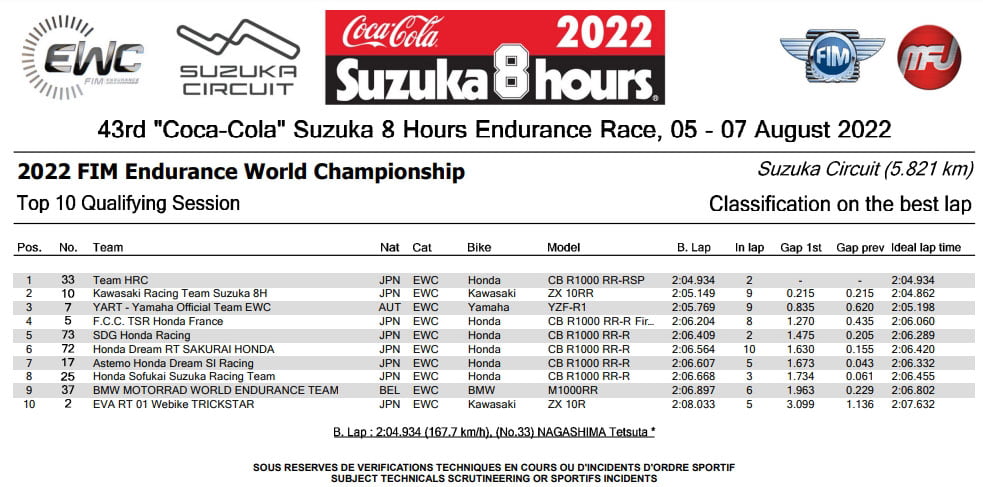 Bien qu’il s’agisse d’une séance de qualification de 40 minutes remplaçant le fameux Top 10 Trial annulé en raison de la menace de pluie, le spectacle n’a pas manqué. L’édition 2022 des 8 Heures de Suzuka verra le Team HRC s’élancer en pole position grâce à un Tetsuta Nagashima déchaîné, auteur du nouveau record du tour à Suzuka dans un week-end de course de 8 heures en 2’04″934. Le pilote d’essai officiel de Honda en MotoGP et Superbike, après un impressionnant 2’04″942 établi hier, a encore progressé, se payant le luxe de battre le sextuple champion du monde Jonathan Rea en comparaison directe.