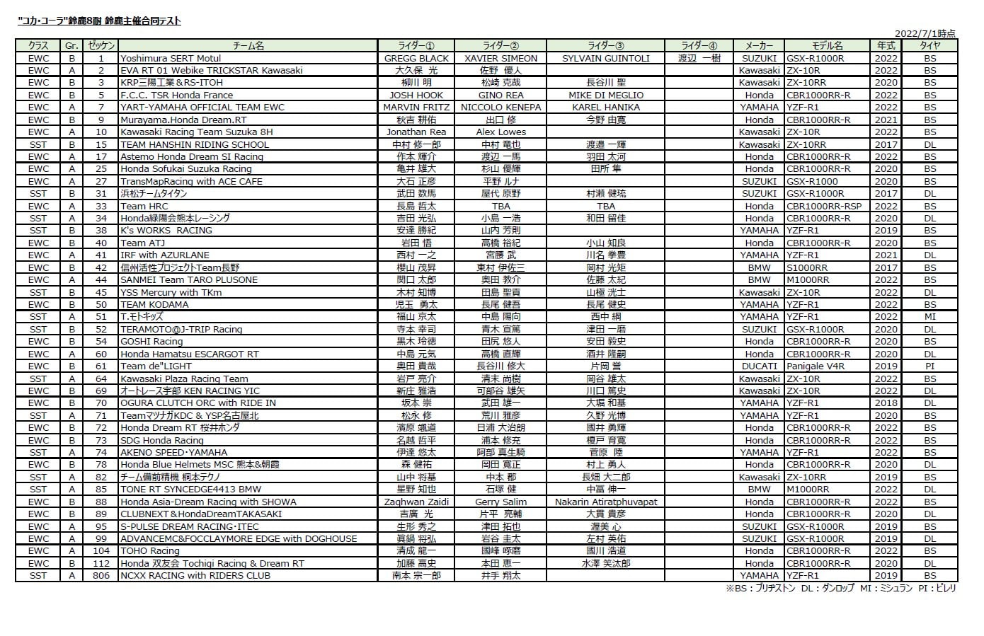 LISTE PROVISOIRE DES ENGAGEMENTS DES 8 HEURES DE SUZUKA 2022