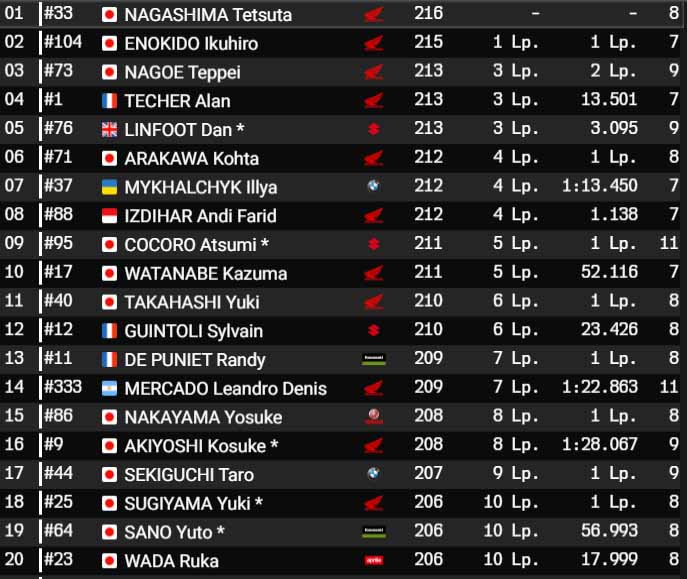 Suit la Honda #1 bien revenue (qui reprend la tête du championnat du monde), puis, enfin, la première Suzuki avec la #76 AutoRace Ube Racing Team. En l’absence de Ducati, BMW n’a rien pu faire par manque de rythme, et la Kawasaki #11 Team Kawasaki WeBike Trickstar a également essuyé deux gros ennuis mécaniques, notamment au niveau de l’amortisseur.