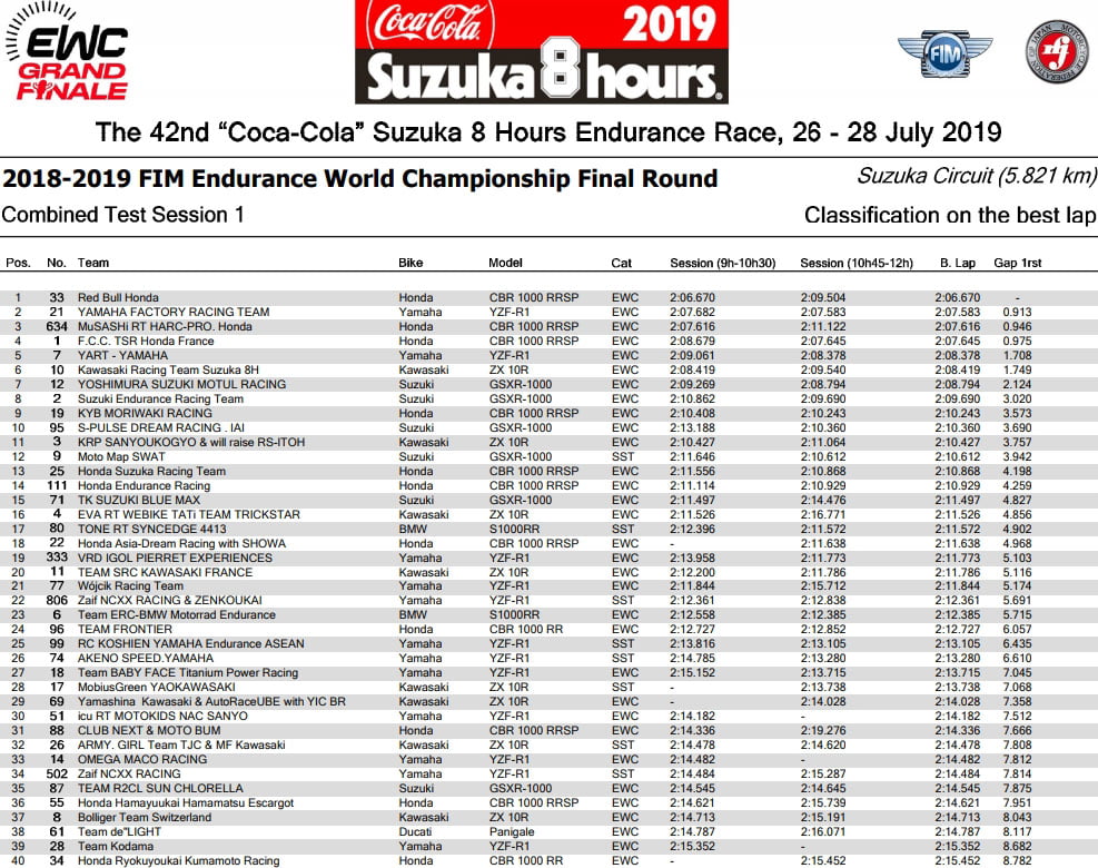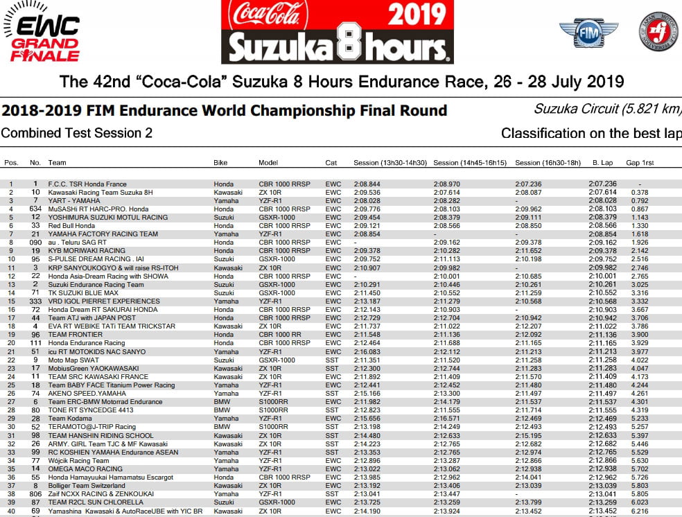 Au cours des heures suivantes, les chronos augmentaient proportionnellement à la hausse des températures mais l’on notait que la hiérarchie globale était loin d’être encore établie, avec le leadership de la Yamaha #21 officielle dans la 2e séance (2’07.583), celui de la Yamaha #7 du YART dans la 3e (en 2’08.028), celui de la Kawasaki #10 officielle dans la 4e (en 2’07.614), et enfin celui de la Honda #1 F.C.C. TSR Honda France dans la dernière, qui réalise le 2e meilleur temps de la journée (2’07.236).