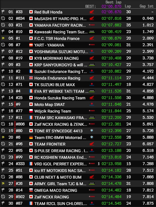 Après ce coup de bambou asséné par les hommes de Tokyo, la concurrence a mis un certain temps à réagir, à l’image du team MuSASHi RT HARC-PRO.Honda avec Dominique Aegerter, auteur du 2e temps de la séance à presque une seconde… Après 23 tours !